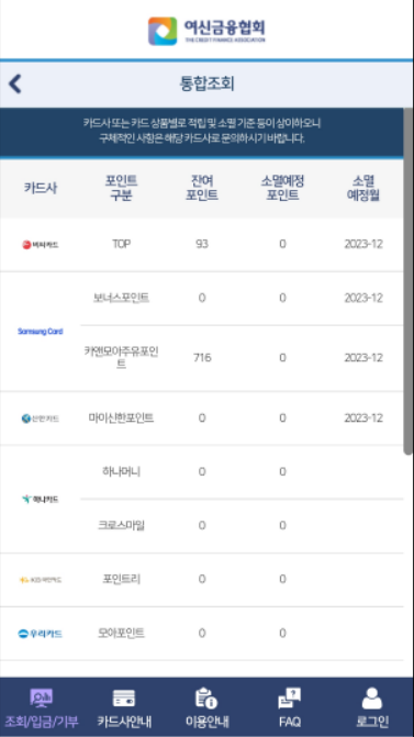 인증을 마친 이후 카드포인트 통합조회를 하면 위의 사진과 같이 각 카드사별 조회내역이 나옵니다.