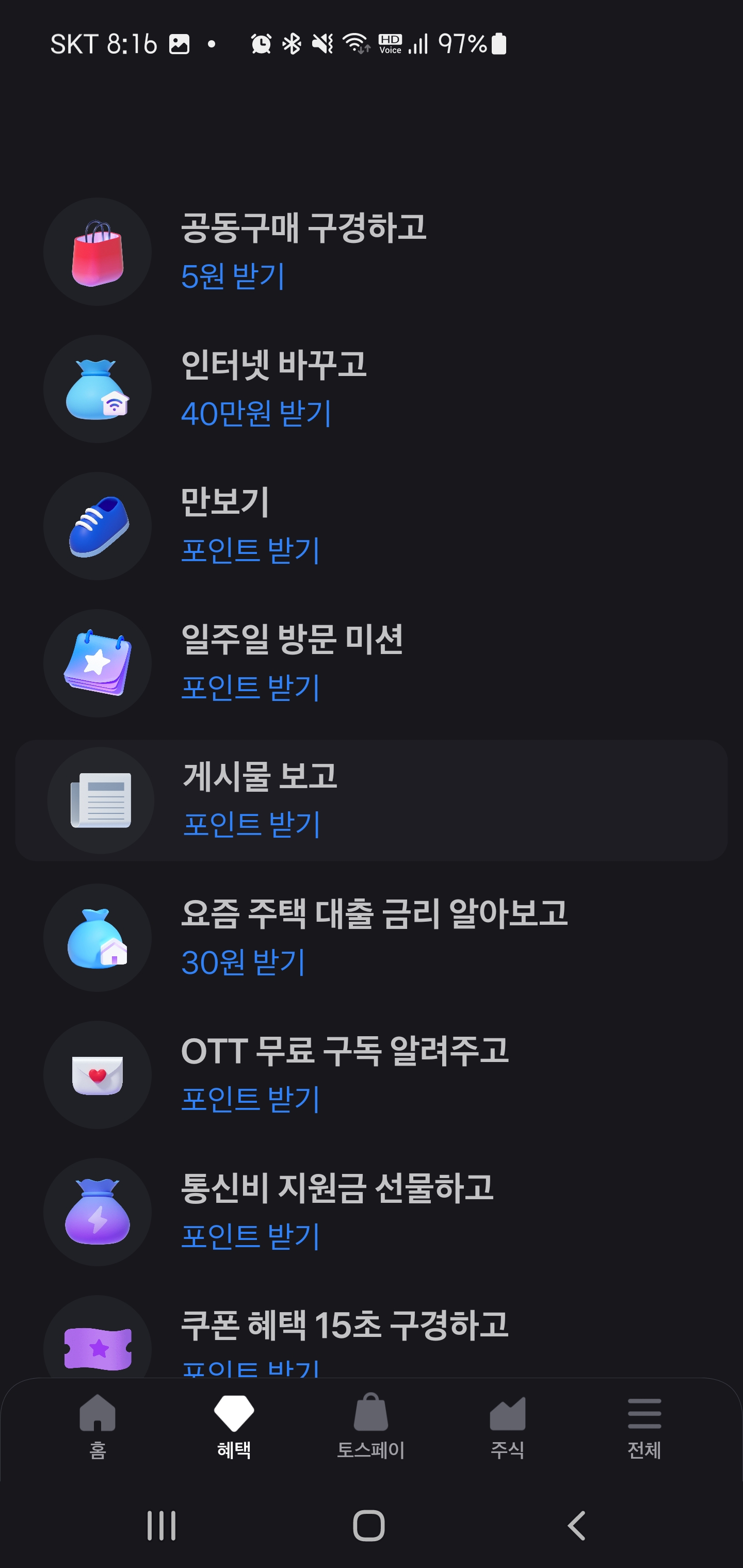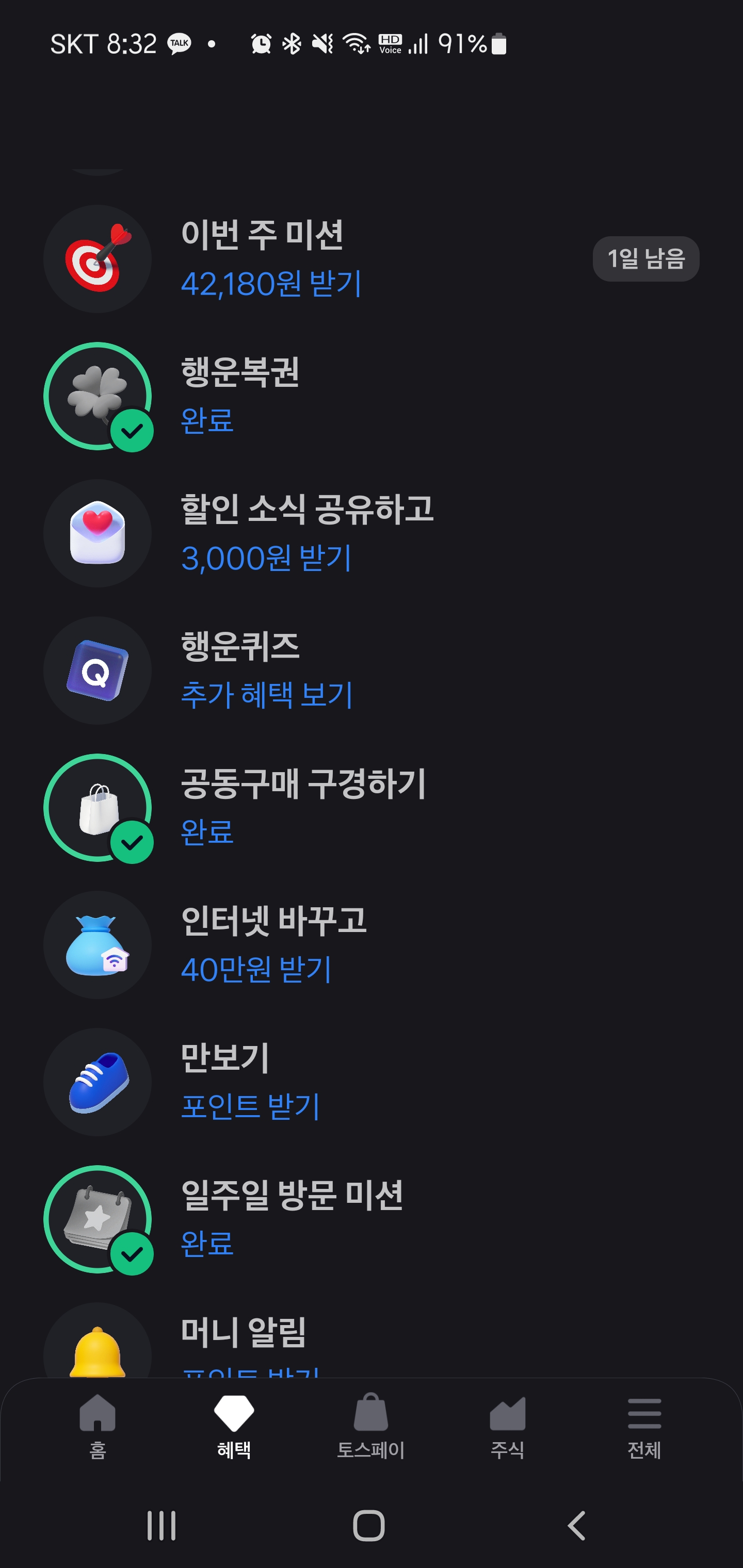 이외에도 여러가지 메뉴가 있지만 잠시 짬을 내서 할 수 있는 것들 위주로 알아보았습니다. 그 외 토스페이나 주식 아이콘이 더 있으며 소비를 관리하는 소비 다이어리, 자산, 대출, 보험 등 여러 가지 탭이 존재합니다. 자세한 구성은 다음 편에 올릴 수 있도록 하겠습니다. 좋은 하루 보내세요.