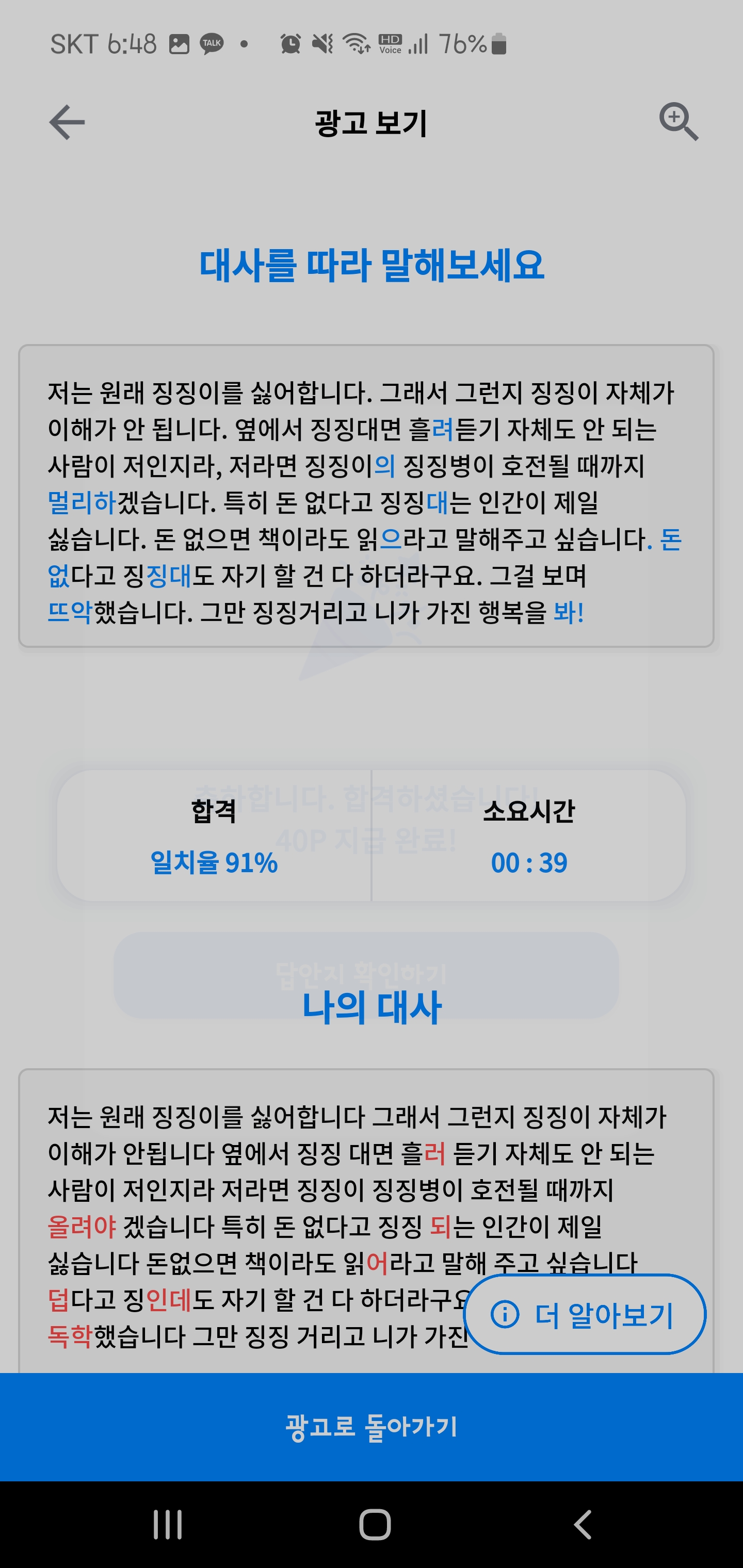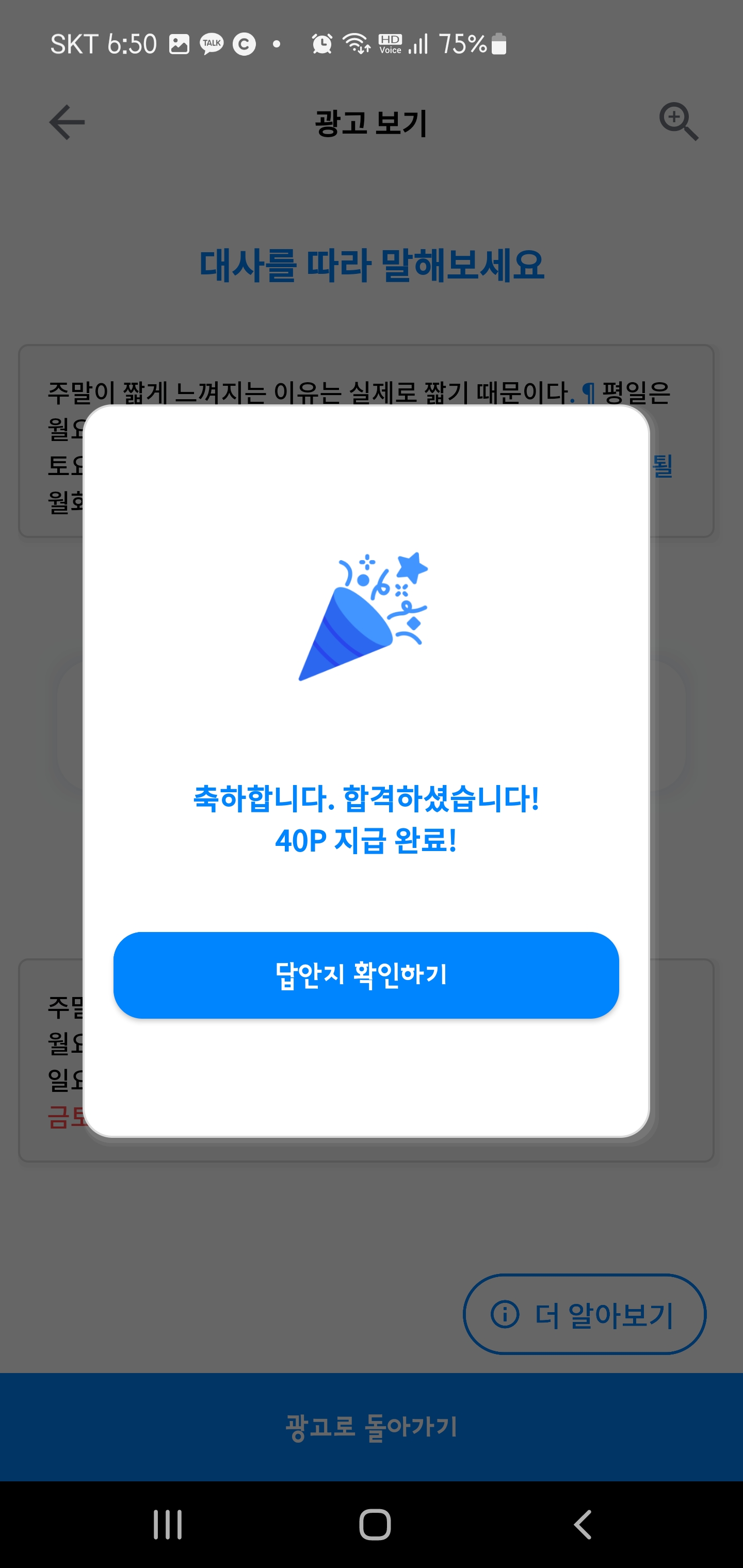 텍스트를 모두 읽으면 결과를 확인하시겠습니까?라는 팝업이 뜬 후에 확인하기를 누르면 포인트 획득여부와 답안지를 확인할 수 있습니다.